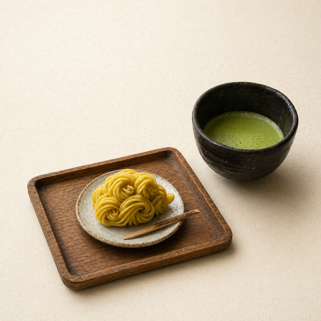 Kurigumo丹波の和栗を細く絞り出し、雲のような意匠に仕立てた秋の主菓子。手仕事の軌跡が、季節の移ろいをそのままお口に運びます。